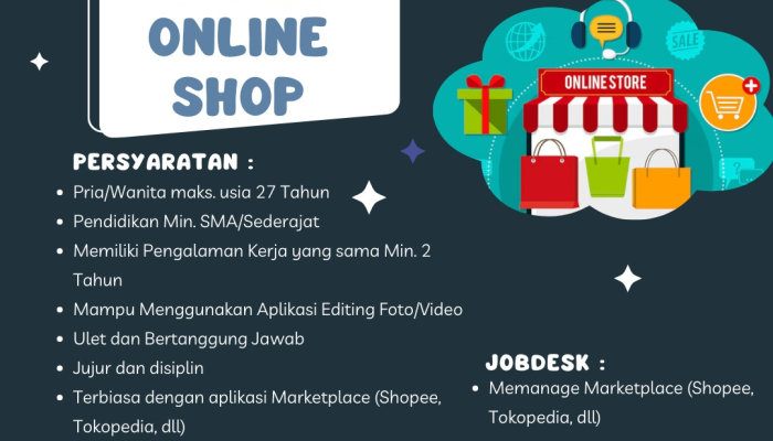 Apakah Anda seorang yang detail, mahir mengoperasikan marketplace, dan berdomisili di Tasikmalaya? Saat ini, sebuah unit bisnis Online Shop di Tasikmalaya sedang membuka kesempatan karir bagi Anda untuk bergabung sebagai Admin Online Shop Full Time. Kami mencari individu yang jujur, disiplin, dan memiliki semangat tinggi untuk membantu pertumbuhan toko kami di berbagai platform digital.
