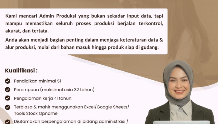Kami mencari individu yang bukan sekadar mampu menginput data, tetapi juga memiliki kemampuan untuk memastikan seluruh proses produksi berjalan terkontrol, akurat, dan tertata dengan baik. Jika Anda adalah tipe orang yang merasa tenang saat semuanya rapi, this role is built for you!