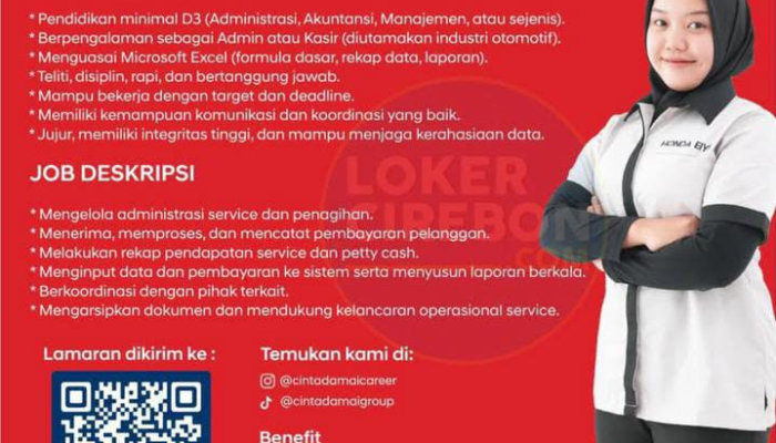 Apakah Anda seorang yang teliti, jujur, dan memiliki keahlian dalam administrasi keuangan? Honda Eiyu (PT Cinta Damai Group), dealer resmi motor Honda terkemuka, kini membuka peluang karir eksklusif bagi Anda untuk mengisi posisi Admin Service & Kasir di cabang Indramayu.