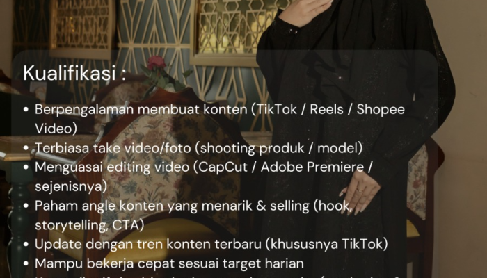 - Memiliki pengalaman di bidang Fashion Designer (diutamakan muslim wear).