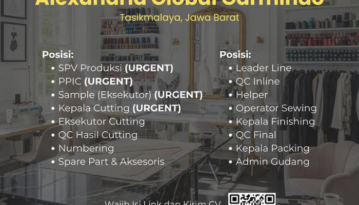 Apakah Anda mencari peluang karir di industri garmen yang sedang berkembang pesat? Alexandria Global Garmindo (Kalisha), perusahaan garmen terkemuka di Tasikmalaya, Jawa Barat, saat ini membuka lowongan kerja besar-besaran untuk berbagai posisi strategis. Kami mencari individu yang kompeten, berdedikasi, dan siap bekerja dalam tim untuk mendukung kemajuan produksi kami.