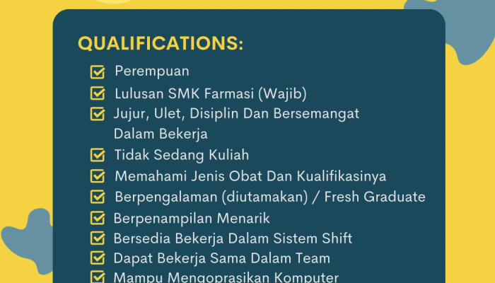 - Pendidikan: Lulusan SMK Farmasi (Wajib).