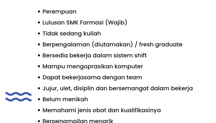 - Lulusan SMK Farmasi (Wajib).