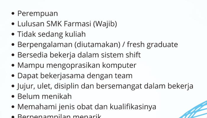 - Lulusan SMK Farmasi (Wajib).