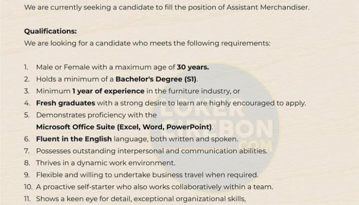 Jika Anda yakin memenuhi kualifikasi dan siap menjadi Assistant Merchandiser di MPP Furniture, segera kirimkan dokumen lamaran Anda sebelum batas waktu yang ditentukan.