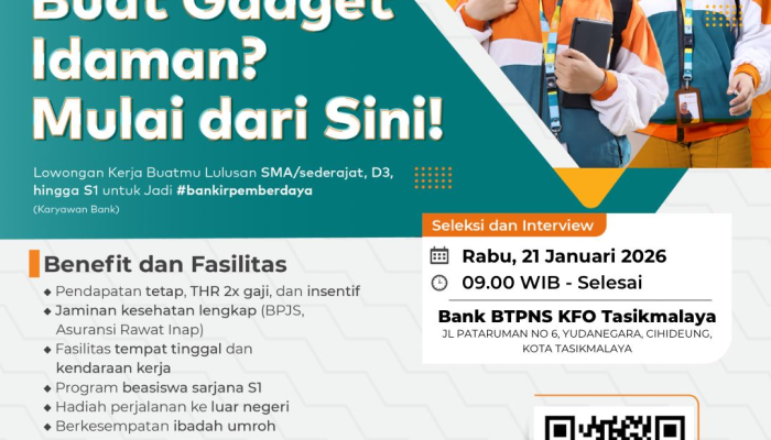 - Lokasi Seleksi: Bank BTPNS KFO Tasikmalaya, Jl. Pataruman No. 6, Yudanegara, Cihideung, Kota Tasikmalaya.