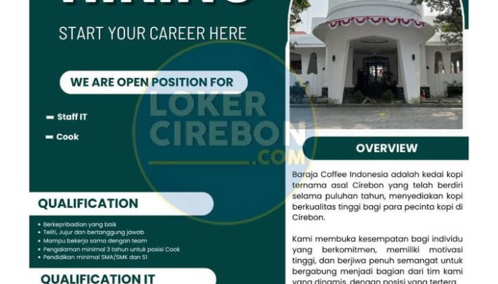 Apakah Anda seorang profesional di bidang IT atau seorang ahli kuliner yang berdedikasi? Baraja Coffee Indonesia, kedai kopi ternama yang telah melegenda selama puluhan tahun di Cirebon, kini membuka kesempatan bagi Anda untuk berkembang bersama tim kami yang dinamis.