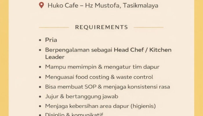 Apakah Anda seorang pecinta kopi yang bersemangat atau seorang ahli kuliner yang siap memimpin dapur? Huko Coffee & Eatery, salah satu destinasi kuliner populer di Tasikmalaya, sedang membuka kesempatan emas bagi Anda untuk bergabung dalam tim profesional mereka. Kami mencari individu yang berdedikasi dan memiliki passion tinggi di bidang Food & Beverage untuk mengisi posisi strategis di cabang HZ Mustofa.