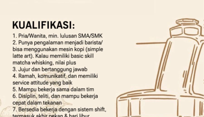 • Diutamakan memiliki Pengalaman Menjadi Barista atau memiliki kemampuan dasar dalam mengoperasikan mesin kopi (minimal untuk membuat simple latte art).