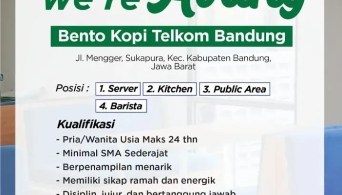 Suka kopi dan ingin bekerja di lingkungan yang dinamis? Bento Kopi Telkom Bandung membuka peluang karir bagi Anda yang bersemangat, ramah, dan ingin menjadi bagian dari industri kopi yang sedang berkembang pesat. Kami mencari individu yang jujur dan bertanggung jawab untuk mengisi berbagai posisi. Jika Anda siap berkontribusi dalam memberikan pengalaman terbaik bagi pelanggan, inilah kesempatan Anda!