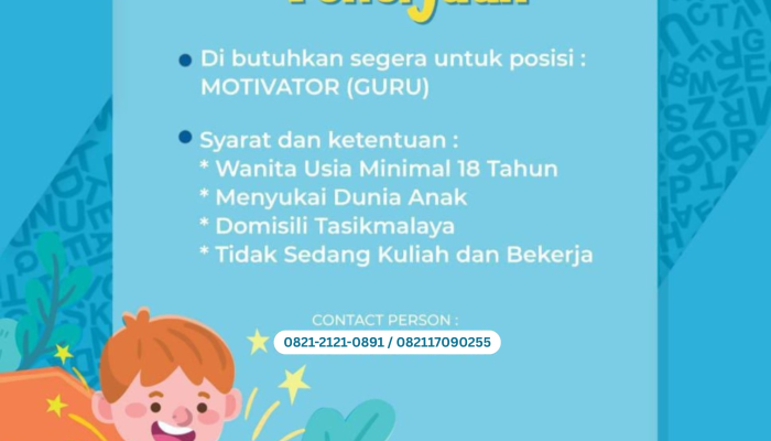 Apakah Anda menyukai dunia anak-anak dan ingin berkontribusi dalam pendidikan usia dini? biMBA AIUEO Panyingkiran, lembaga bimbingan minat baca anak ternama di Tasikmalaya, sedang membuka lowongan kerja untuk posisi Motivator (Guru).