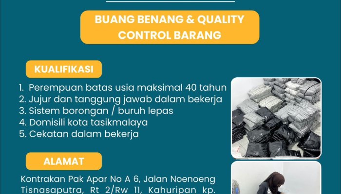 Apakah Anda seorang wanita yang teliti, cekatan, dan sedang mencari peluang kerja di area Tasikmalaya? CV Sulton Avstore saat ini membuka kesempatan karir bagi Anda untuk bergabung sebagai tenaga Buang Benang & Quality Control (QC). Lowongan ini merupakan peluang emas bagi Anda yang ingin bekerja di industri konveksi/retail dengan sistem kerja yang fleksibel.