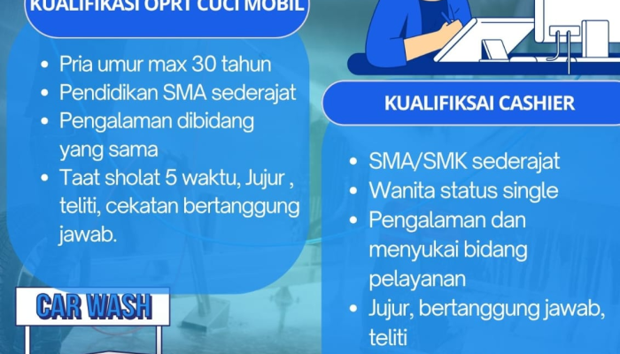 - Operator Cuci Mobil: Bertugas melakukan proses pencucian dan pembersihan kendaraan (eksterior dan interior) sesuai dengan standar operasional perusahaan untuk memastikan kendaraan pelanggan bersih dan mengkilap.