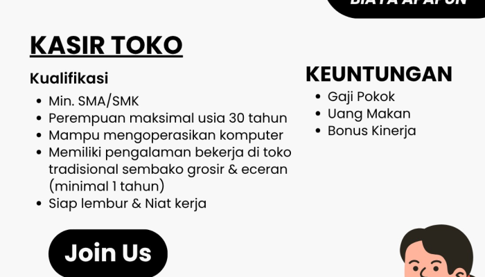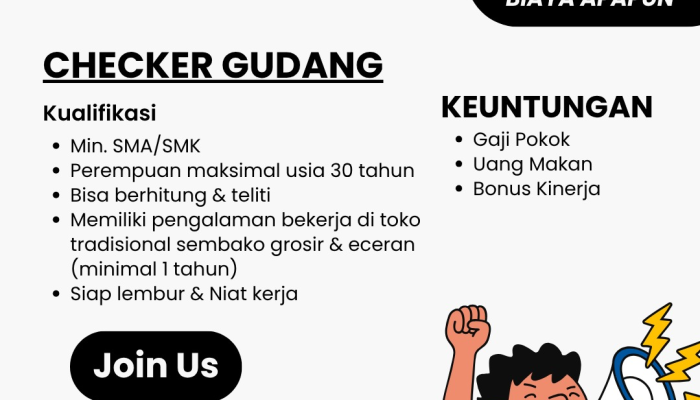 Apakah Anda seorang wanita yang teliti, siap bekerja keras, dan memiliki pengalaman di toko sembako grosir/eceran? Inilah kesempatan emas bagi Anda yang bersemangat untuk memulai atau melanjutkan karir di bidang ritel dan logistik. Kami sedang membuka Lowongan Kerja Checker Gudang dan Kasir Toko untuk penempatan di Kota Tasikmalaya. Jika Anda mencari loker terbaru di Tasikmalaya dengan benefit menarik, pastikan Anda membaca informasi ini sampai selesai!