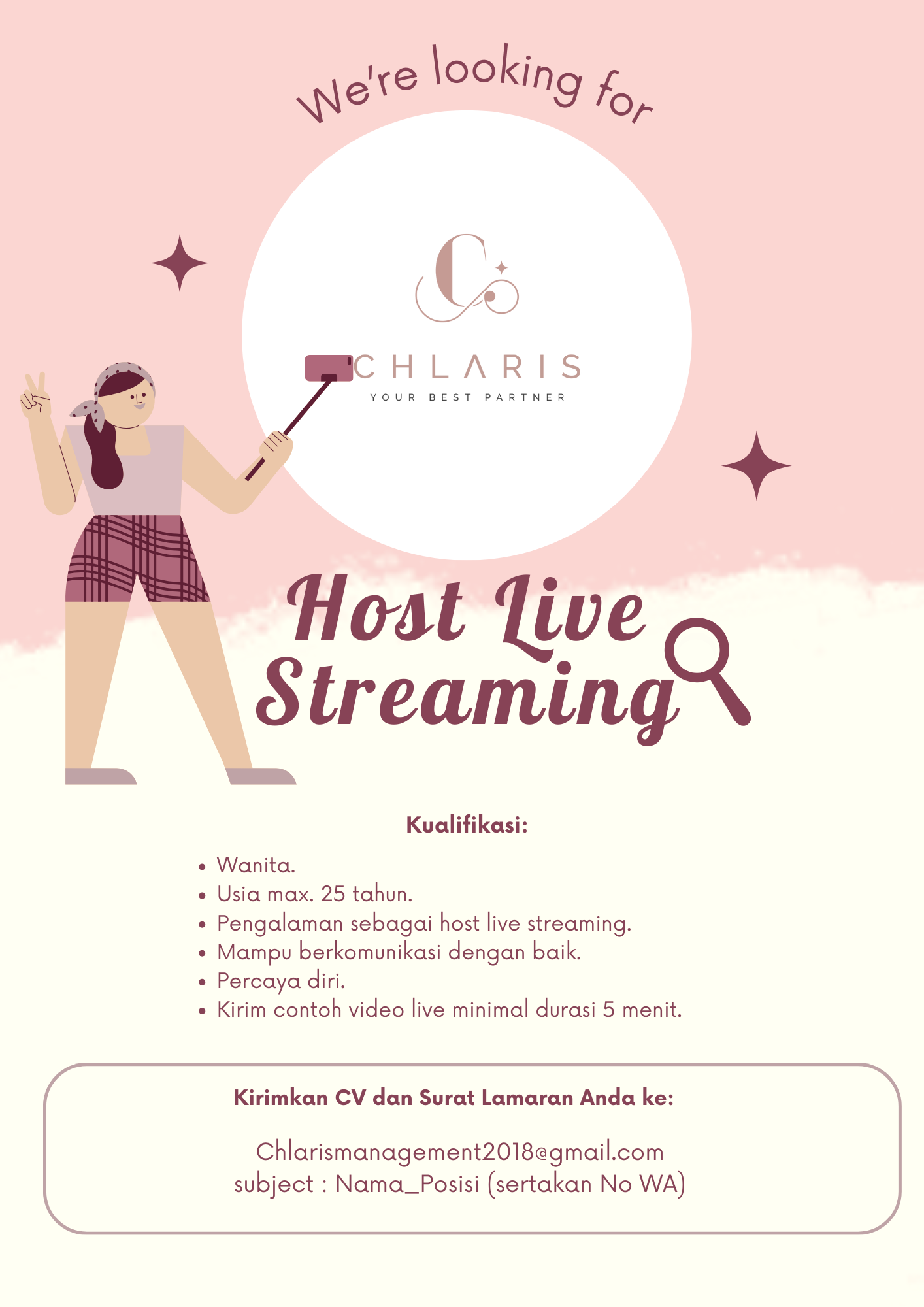 Kirim contoh video live minimal durasi 5 menit, CV dan Surat Lamaran Anda ke:
