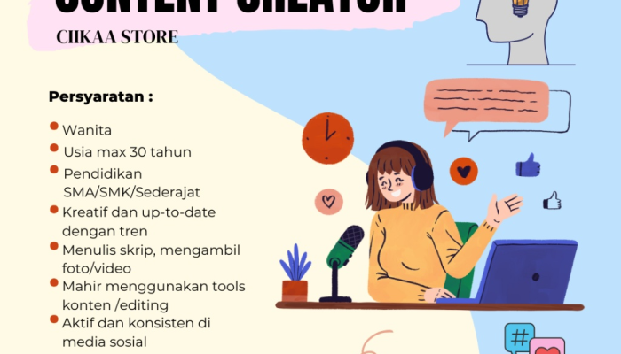 Apakah Anda seorang wanita kreatif, penuh energi, dan mengikuti tren media sosial terbaru? Ciikaa Store, toko ritel modern yang sedang berkembang pesat di Tasikmalaya, sedang mencari talenta muda untuk bergabung sebagai garda terdepan tim kreatif kami. Kami membuka peluang karir untuk posisi Content Creator dan Host Live Streaming.