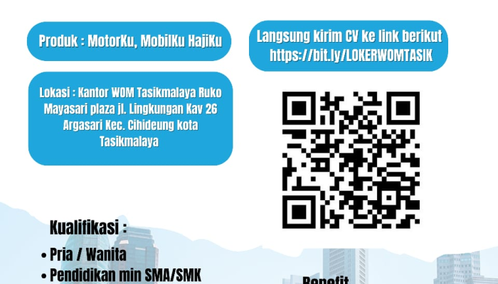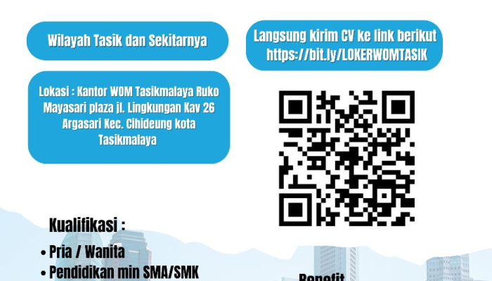 Lokasi Kerja: Kantor WOM Tasikmalaya, Ruko Mayasari Plaza jl. Lingkungan Kav 26 Argansari Kec. Cihideung Kota Tasikmalaya.
