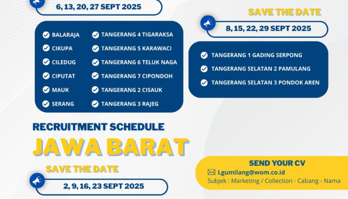 Mencari kesempatan kerja dengan proses yang cepat dan mudah? WOM Finance membuka peluang emas melalui Walk In Interview untuk posisi Marketing dan Collection di berbagai kota di wilayah Banten dan Jawa Barat. Ini adalah kesempatan Anda untuk bergabung dengan tim profesional dan meraih penghasilan tinggi.