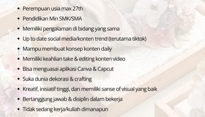 - Memiliki pengalaman di bidang yang sama (misalnya: content creator, admin medsos, atau pengrajin).