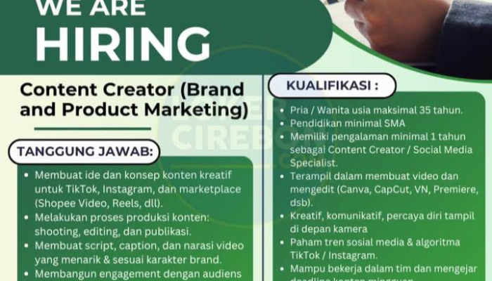 1. Lowongan Content Creator (Brand and Product Marketing) – Cirebon