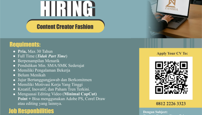 Punya passion di dunia fashion dan jago membuat konten video yang trending? Brand fashion Zanissa di Tasikmalaya sedang mencari seorang Content Creator Fashion yang kreatif, inovatif, dan bersemangat untuk bergabung dengan tim digital marketing kami!