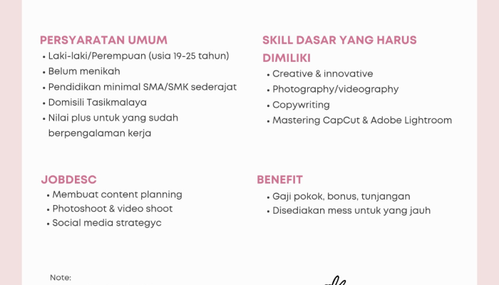 Ini adalah peluang emas bagi Anda yang ingin menyalurkan bakat dalam bidang visual dan strategi media sosial di lingkungan kerja yang dinamis. Simak rincian kualifikasi dan cara melamarnya di bawah ini!