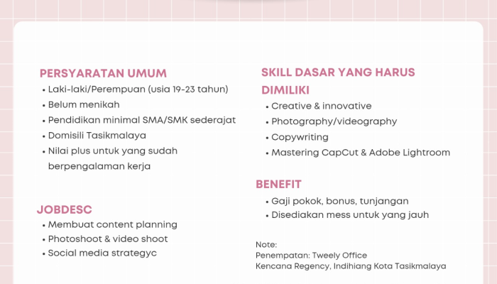 Apakah Anda seorang anak muda kreatif yang hobi membuat konten estetik dan mengikuti tren media sosial? Tweely, brand fashion yang sedang berkembang pesat, sedang mencari talenta berbakat untuk bergabung sebagai Content Creator di Tasikmalaya. Jika Anda memiliki mata yang tajam untuk fotografi dan mahir dalam mengolah video melalui ponsel, ini adalah kesempatan karir yang tidak boleh Anda lewatkan!