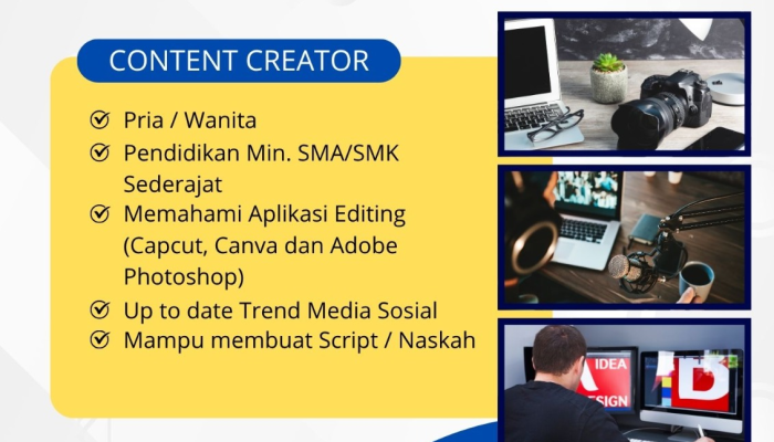 Apakah Anda seorang individu kreatif, selalu up-to-date dengan tren media sosial terkini, dan memiliki passion dalam membuat konten yang menarik? Yellow Home sedang mencari talenta terbaik untuk bergabung sebagai Content Creator yang akan membawa brand kami ke level berikutnya! Ini adalah kesempatan emas bagi Anda yang berdomisili di Tasikmalaya dan siap mengubah ide-ide brilian menjadi konten visual yang memukau dan viral. Jika Anda menguasai Capcut, Canva, Adobe Photoshop, dan jago merangkai skrip, segera kirimkan lamaran Anda! Jangan lewatkan kesempatan karir Content Creator 2025 ini di salah satu perusahaan yang berkembang di Tasikmalaya.
