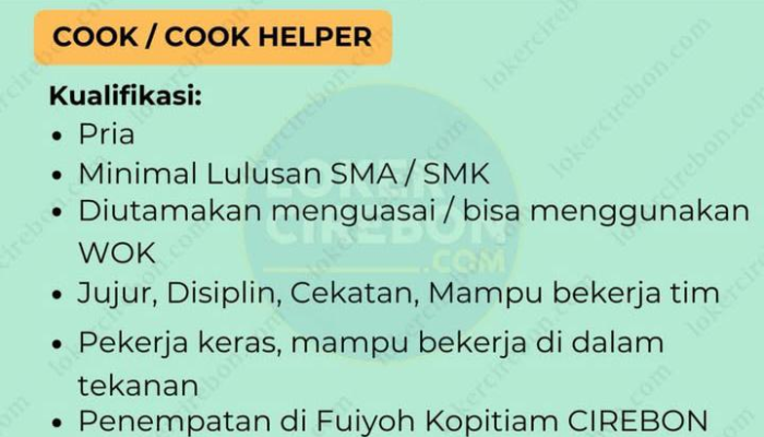 Kami mencari individu yang berdedikasi, cekatan, dan memiliki ketertarikan kuat dalam seni memasak untuk mengisi posisi Cook dan Cook Helper. Bergabung dengan Fuiyoh Kopitiam memberikan Anda kesempatan untuk bekerja di lingkungan yang profesional dan dinamis. Simak rincian kualifikasinya di bawah ini.