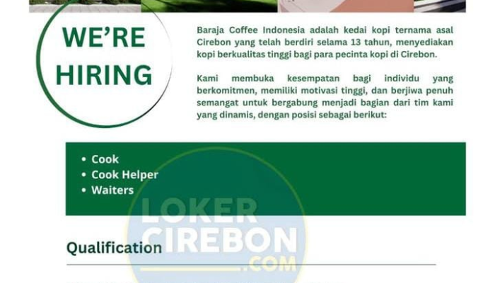 Apakah Anda memiliki minat besar di industri hospitality dan ingin mengembangkan karier bersama kedai kopi ternama? Baraja Coffee Indonesia saat ini membuka kesempatan bagi Anda yang berkomitmen, bermotivasi tinggi, dan berjiwa penuh semangat untuk bergabung menjadi bagian dari tim kami yang dinamis. Jangan lewatkan peluang untuk berkarya di salah satu ikon kuliner kota Cirebon!