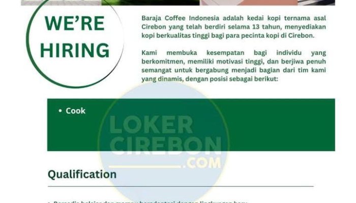 Untuk mengisi posisi Lowongan Kerja Cook di Cirebon ini, Baraja Coffee Indonesia mencari kandidat dengan kriteria berikut: