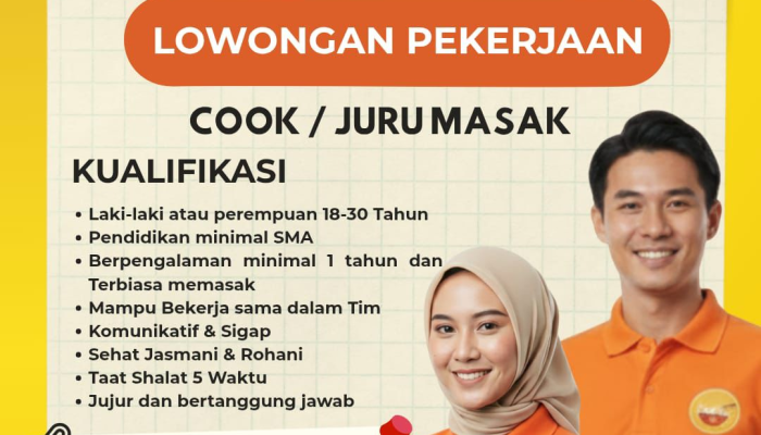 - Pengalaman: Memiliki pengalaman minimal 1 tahun dan terbiasa memasak.