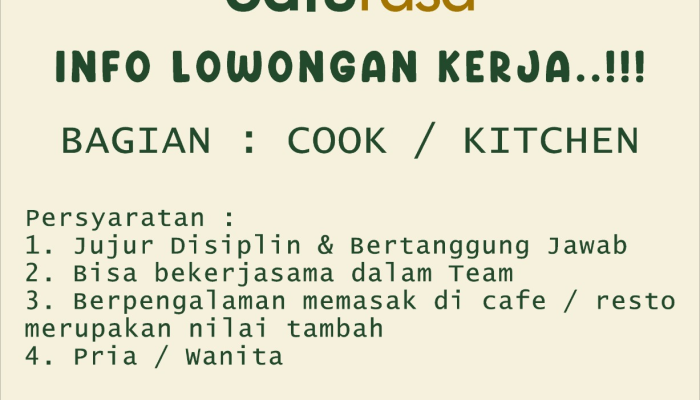 Apakah Anda memiliki gairah di dunia kuliner dan hobi meracik hidangan lezat? Satu Rasa, destinasi kuliner yang sedang berkembang, kini membuka kesempatan bagi Anda untuk bergabung dalam tim operasional kami sebagai bagian dari tim Cook / Kitchen. Kami mencari individu yang berdedikasi dan memiliki semangat tinggi untuk menyajikan rasa terbaik bagi setiap pelanggan.