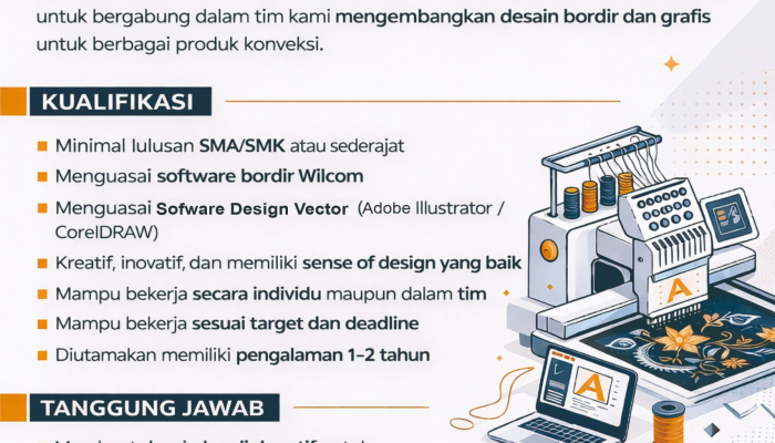 Pastikan portofolio Anda mencantumkan karya desain bordir (Wilcom) atau desain grafis vector untuk mempercepat proses seleksi.