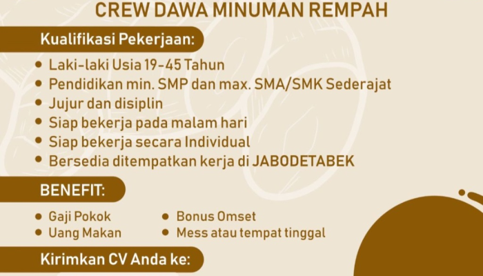Dawa Minuman Rempah adalah sebuah perusahaan yang bergerak di bidang kuliner dengan spesialisasi minuman rempah. Saat ini, kami membuka kesempatan bagi Anda yang energik, jujur, dan bersemangat untuk bergabung sebagai Crew Dawa Minuman Rempah. Lowongan ini terbuka untuk individu yang ingin bekerja dalam lingkungan yang dinamis dan berlokasi di area Jabodetabek.
