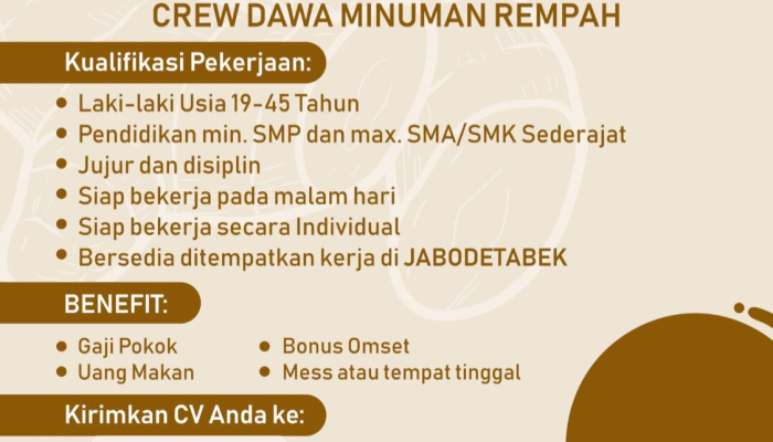 Mencari kesempatan kerja di industri kuliner? Dawa Minuman Rempah, sebuah usaha yang sedang berkembang, membuka lowongan kerja terbaru untuk posisi Crew. Jika Anda individu yang jujur, disiplin, dan siap bekerja di malam hari, kami mengundang Anda untuk bergabung dengan tim kami. Ini adalah kesempatan bagus untuk memulai karir di dunia Food and Beverage (F&B) dengan benefit yang menarik!