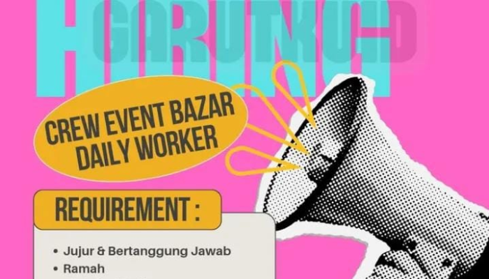 Apakah Anda pribadi yang aktif, komunikatif, dan sedang mencari pengalaman kerja seru di bidang event? Ini adalah kesempatan yang tepat untuk Anda! Loker Garutku Id sedang mencari individu yang dinamis untuk bergabung sebagai Crew Event Bazar (Daily Worker). Jika Anda menyukai tantangan, fleksibel dengan waktu, dan ingin menambah penghasilan tambahan, mari daftarkan diri Anda sekarang juga!