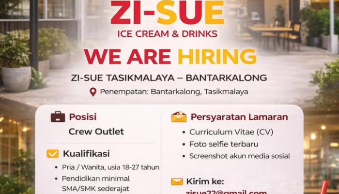Apakah Anda pribadi yang ceria, enerjik, dan menyukai interaksi dengan pelanggan? Zi-Sue Ice Cream & Drinks sedang membuka kesempatan karir bagi Anda untuk bergabung sebagai Crew Outlet untuk penempatan cabang Bantarkalong, Tasikmalaya. Jadilah bagian dari tim kami dan berikan keceriaan melalui sajian es krim dan minuman segar kepada setiap pelanggan!