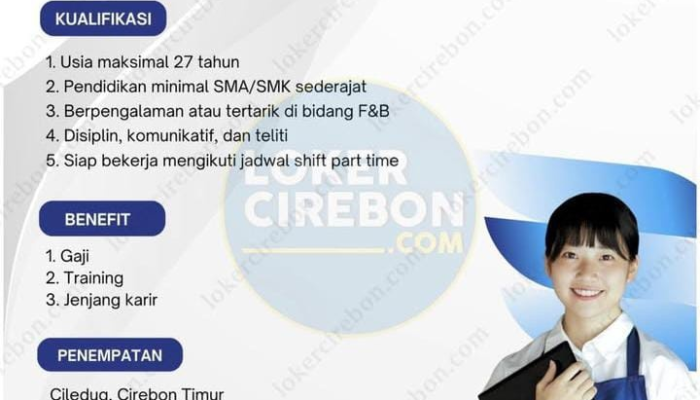 Apakah Anda seorang pelajar, mahasiswa, atau pencari kerja yang sedang mencari penghasilan tambahan dengan waktu kerja yang fleksibel? J.Chicken Indonesia sedang membuka kesempatan karir menarik bagi Anda untuk bergabung sebagai Crew Part Time untuk penempatan di wilayah Cirebon Timur.