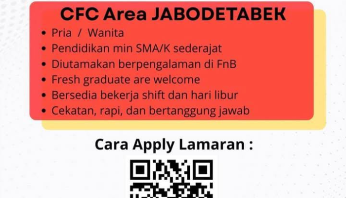 Lokasi Kerja: Penempatan Area JABODETABEK (Jakarta, Bogor, Depok, Tangerang, Bekasi). Catatan Penting: Hati-hati terhadap penipuan! Segala proses seleksi di CFC tidak dipungut biaya apapun.