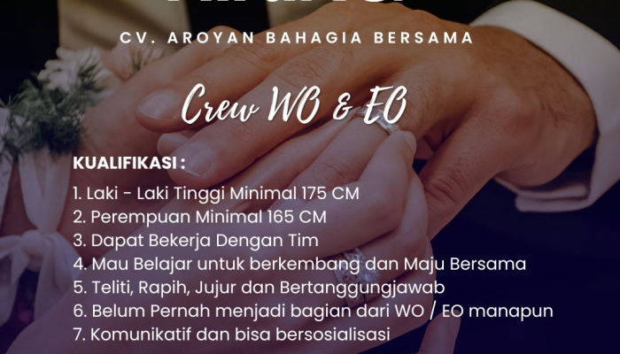 CV. AROYAN BAHAGIA BERSAMA, yang dikenal sebagai Royan and Friends, membuka kesempatan bagi individu yang bersemangat untuk bergabung sebagai Crew WO (Wedding Organizer) & EO (Event Organizer). Kami mencari individu yang berdedikasi, teliti, dan memiliki kemampuan bersosialisasi yang baik untuk menjadi bagian dari tim profesional kami.