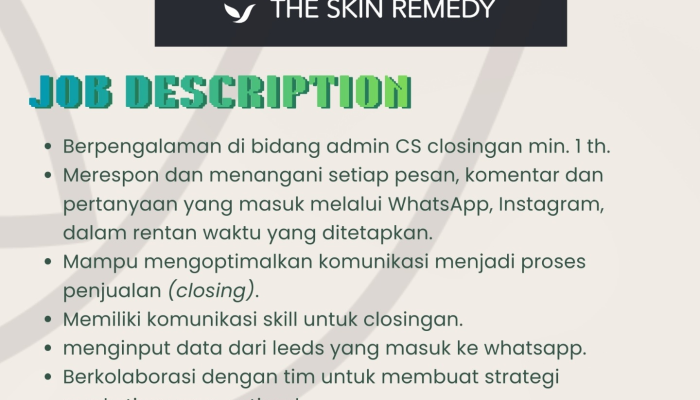 Apakah Anda seorang komunikator handal yang mahir dalam mengubah interaksi menjadi penjualan (closing)? The Skin Remedy, unit usaha yang sedang berkembang di industri kecantikan, sedang membuka lowongan kerja terbaru untuk posisi Customer Service (CS) Closing. Penempatan kerja dikhususkan secara in-house di wilayah Kota Tasikmalaya.