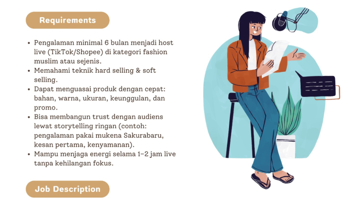 • Pengalaman minimal 6 bulan menjadi host live (TikTok/Shopee) di kategori fashion muslim atau sejenis.