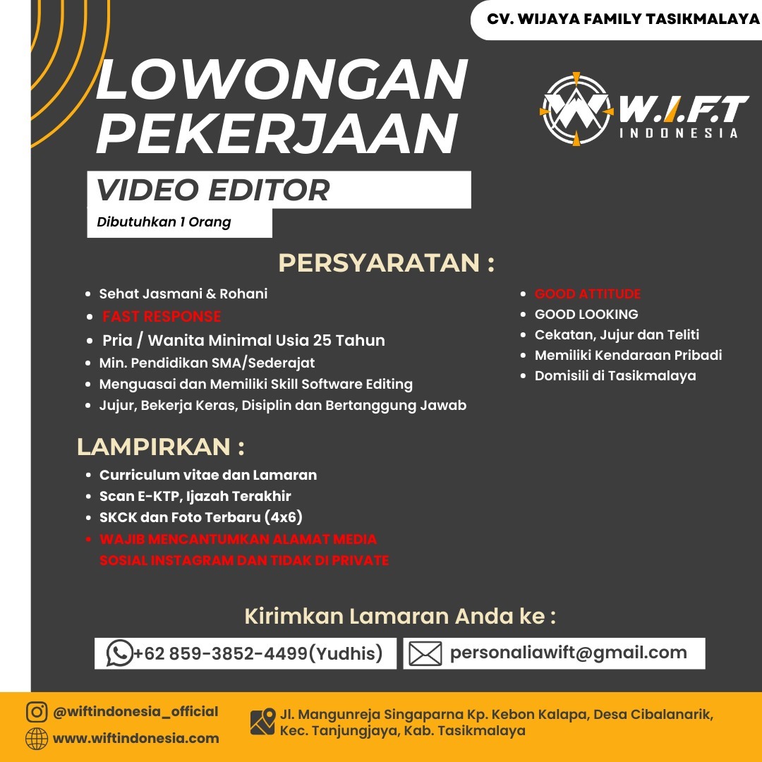 CV. Wijaya Family Tasikmalaya (W.I.F.T Indonesia) membuka kesempatan bagi individu berbakat dan bersemangat untuk bergabung sebagai Video Editor. Saat ini, perusahaan membutuhkan satu orang kandidat untuk mengisi posisi ini.