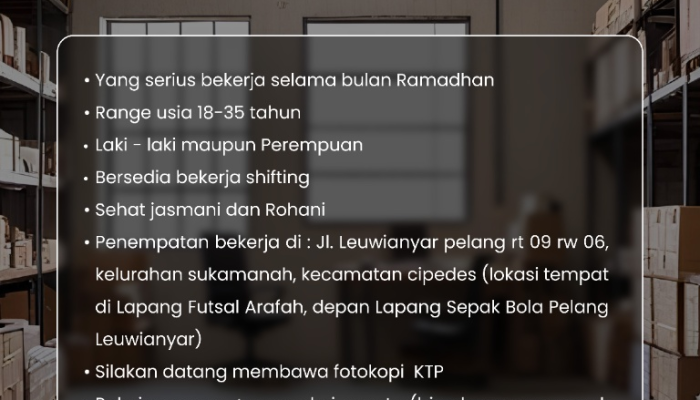 Apakah Anda sedang mencari penghasilan tambahan sekaligus ingin tetap produktif selama bulan suci? Saat ini, tersedia kesempatan emas bagi Anda yang berdomisili di wilayah Tasikmalaya dan sekitarnya. Kami membuka lowongan kerja untuk posisi Daily Worker yang akan bertugas membantu kelancaran operasional selama periode bulan Ramadhan.