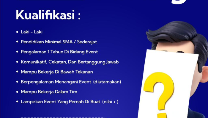 • Event Staff: Laki-laki, minimal SMA/Sederajat, berpengalaman minimal 1 tahun menangani event.
