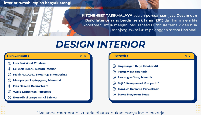 Kitchenset Tasikmalaya membuka kesempatan karier untuk posisi Desain Interior, bagi Anda yang siap bergabung dengan tim profesional dan berpengalaman.