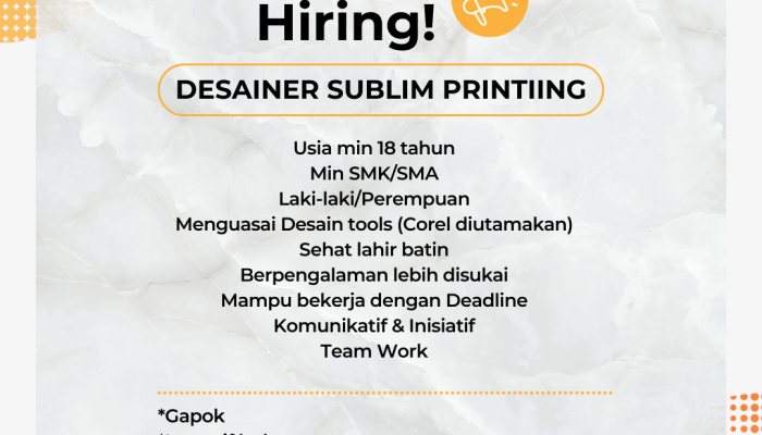 Apakah Anda seorang kreatif yang mahir dalam desain grafis dan sedang mencari peluang karir di industri percetakan? Caldera Corner, penyedia layanan printing terkemuka di Tasikmalaya, sedang membuka kesempatan bagi Anda untuk bergabung sebagai Desainer Sublim Printing.