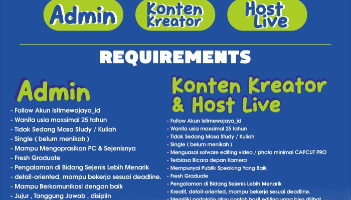 - Detail-oriented, mampu bekerja sesuai deadline, jujur, tanggung jawab, dan disiplin.