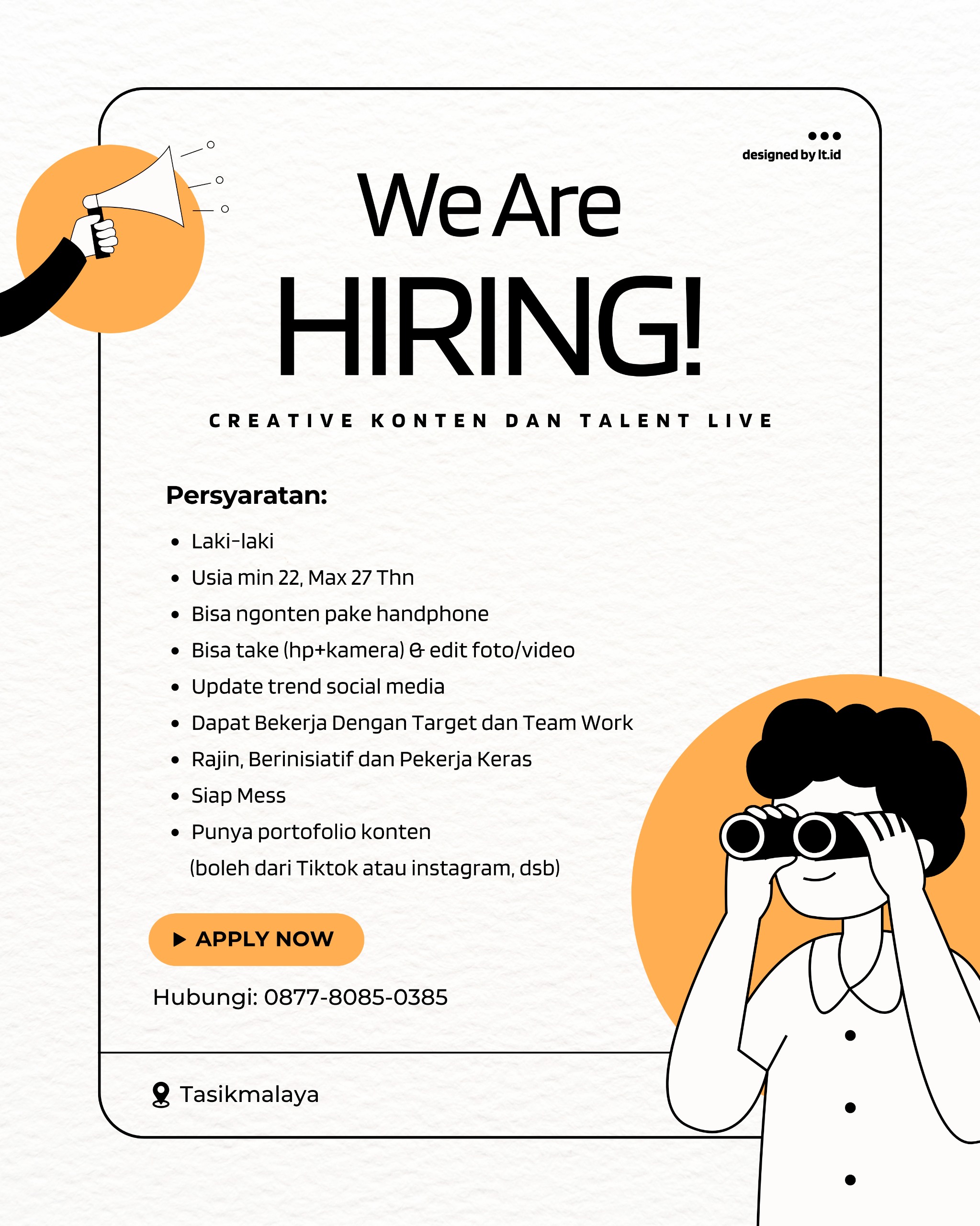 Lokertasikmalaya.ID – Update Info lowongan Kerja 28 Mei 2025, Lowongan Kerja Kontent Kreator dan Talent
